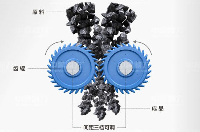 雙齒輥破碎機(jī)在工作時(shí),物料進(jìn)入破碎腔,通過(guò)高速旋轉(zhuǎn)兩齒輥對(duì)物料進(jìn)行剪切、擠壓、拉伸等作用對(duì)物料進(jìn)行破碎,齒輥中心距三擋可調(diào),保障出料粒度。