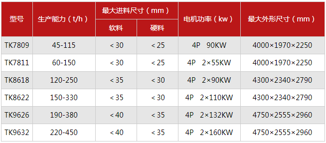 1、TK7809型破碎機:生產(chǎn)能力45-115T/H、下料粒度(軟料 于30、硬料 25)、電動機功率90kw、外形尺寸4000×1970×2250mm;