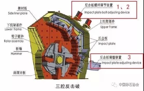 調(diào)整反擊架與轉(zhuǎn)子架之間的間隙可達到改變物料出料粒度和形狀的目的。、二反擊板通過頂部螺桿調(diào)節(jié)裝置,若存在第三塊反擊板(歐版反擊破),則通過墊片調(diào)節(jié)。