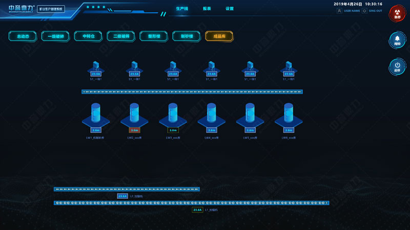 DCS系統(tǒng)可可設(shè)置半成品料庫、中碎篩分料倉、成品料庫料位高度上上限、上限和下限值,并有停機(jī)及報警提醒。