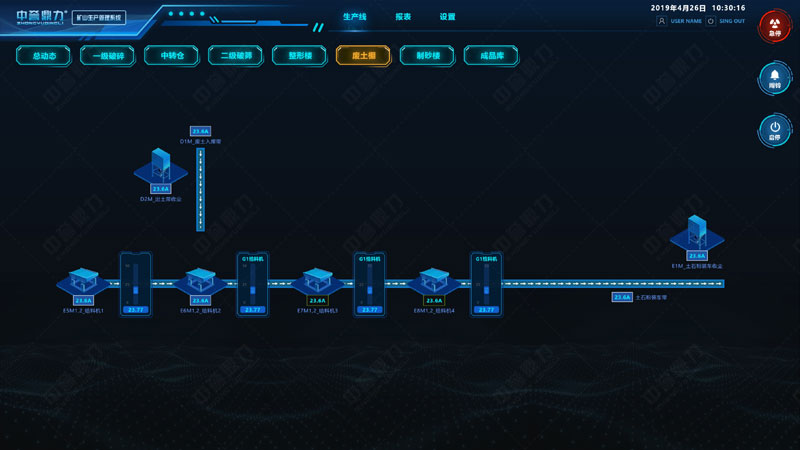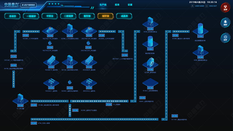 礦山生產(chǎn)管理系統(tǒng)三維形式展現(xiàn)整個生產(chǎn)線,可遠(yuǎn)程控制砂石骨料線的給料機(jī)、破碎機(jī)、皮帶機(jī)、制砂機(jī)、振動篩等各設(shè)備的啟停,通過傳感裝置感知設(shè)備運(yùn)行狀態(tài)(如設(shè)備溫度、電壓、電流、振頻等數(shù)據(jù)),可監(jiān)測生產(chǎn)線產(chǎn)量、各儲料倉料位高度等信息,自動生成報表,實(shí)現(xiàn)礦山生產(chǎn)環(huán)節(jié)的智能化操控管理及生產(chǎn)決策。