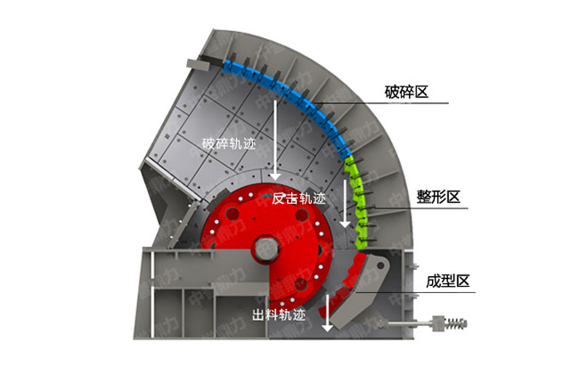 通過電動機帶動轉子的高速旋轉,由于轉子的高速旋轉,當物料進入板錘作業(yè)區(qū)時,受到錘頭的沖擊、碰撞、剪切等作用而破碎,已破碎的石料被拋到反擊裝置上得到再次破碎,之后被彈回板錘作用區(qū)重新破碎,石料經(jīng)過多次反復破碎直至合格被排出。