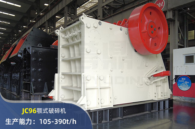 JC96顎式破碎機進料口尺寸930×580mm,進料粒度≤480mm,出料大小≤60mm,電機功率90kw,時產(chǎn)在390噸左右。