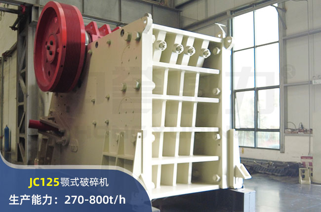 JC125顎式破碎機(jī)進(jìn)料口尺寸1250-950mm,進(jìn)料粒度≤810mm,出料大小≤100mm,電機(jī)功率160kw,時產(chǎn)量在800噸左右。