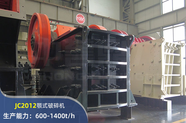 JC2012顎式破碎機進(jìn)料口尺寸2000×1200mm,進(jìn)料粒度≤1020mm,出料大小≤175mm,電機功率355kw,時產(chǎn)量在1400噸左右。