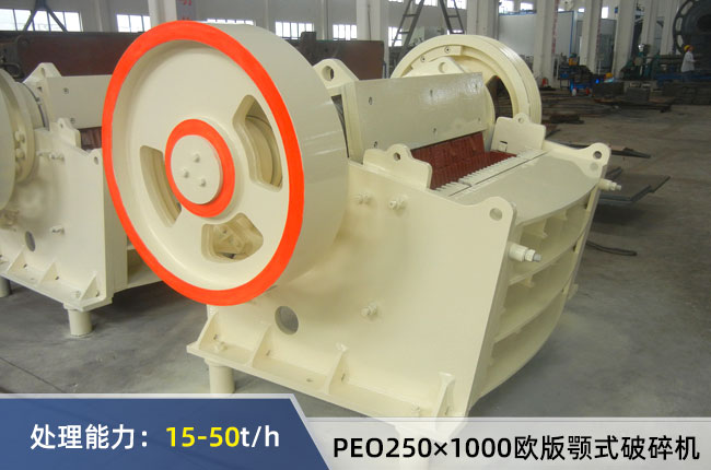 PEO250×1000歐版顎式破碎機(jī)進(jìn)料口大小250×1000mm,進(jìn)料≤220mm,出料20-40mm之間,時(shí)產(chǎn)量15-50噸,配置的電機(jī)功率是37kw,外型尺寸1400×1850×1310mm,重量是5.6噸。