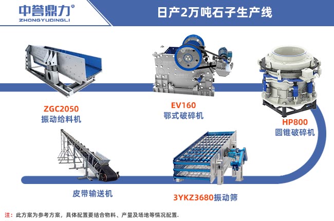 配置一條日產(chǎn)2萬噸石子生產(chǎn)線需要用到給料設(shè)備、破碎設(shè)備、輸送設(shè)備以及篩分設(shè)備等配套設(shè)備,根據(jù)客戶不同硬度的物料,可以分多種配置方法,如下所示: