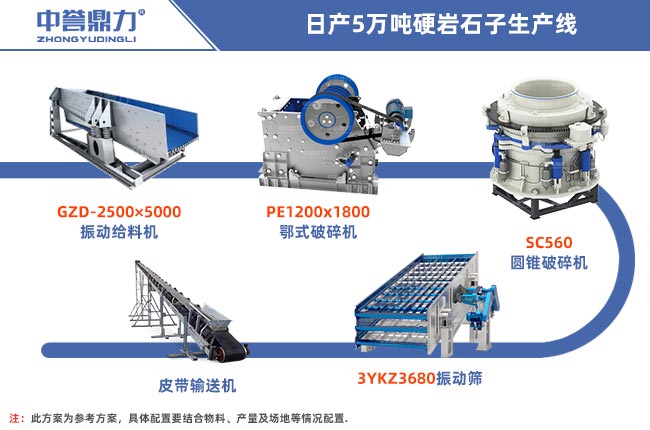 日產(chǎn)5萬噸碎石投資方案設(shè)備搭配比較靈活,可以根據(jù)自己的物料屬性、資金狀況進(jìn)行合理選擇,下面以兩種常見的軟巖(石灰石、青石等)處理方案和硬巖(鵝卵石、花崗巖等)處理方案為列: