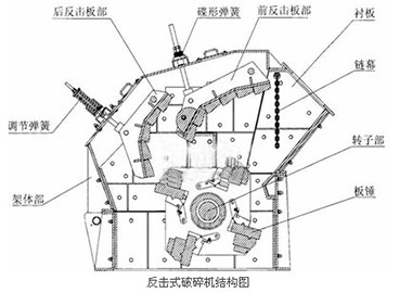 結(jié)構(gòu)組成:反擊式破碎機(jī)主要由破碎機(jī)轉(zhuǎn)子、主軸、破碎板錘、反擊板、反擊彈簧裝置、反擊護(hù)板等主要部件組成。