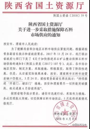 為了緩解我省部分地區(qū)石料市場供應(yīng)緊張問題,根據(jù)梁桂常務(wù)副省長批示和省要求,2017年11月24日,我廳聯(lián)合省七部門下發(fā)了《關(guān)于加快推進采石礦山整治保障石料市場供給的通知》(陜土資發(fā)[2017]107號)。此后,各市結(jié)合地區(qū)實際,制定方案,采取措施,積落實,取得了階段性進展。但是,從目前實際效果來看,西安、渭南兩市石料市場需求缺口較大。3月24日,梁桂常務(wù)副省長再次批示:“持續(xù)推進‘開前門、堵后門’措施,西安和渭南要盡所能僵局。相關(guān)進展6月份前再報”。
