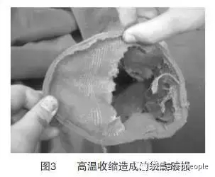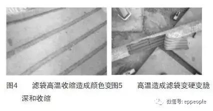 高溫煙氣對濾袋的另外一種損害是高溫收縮,雖然每種濾料的使用溫度不同,但當煙氣溫度過其使用溫度后,如其經向收縮率過大,會使濾袋在長度方向上尺寸變短,濾袋袋底緊托著骨架并受力而損壞(如圖3)。如果濾袋緯向熱收縮過大,將使濾袋在徑向尺寸變小,濾袋會緊緊箍在骨架上,甚至無法抽出骨架。從而使濾袋處于受力狀態(tài),造成濾袋的收縮變形、變硬、變脆,加快強度耗損、減短濾袋壽命。由于濾袋變形后會緊緊箍在骨架上,在清灰時濾袋難以變形而不利于噴吹清灰,導致濾袋阻力居高不下。