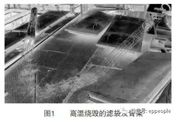 高溫對濾袋的損害是致命的。如黑龍江某煤粉干燥窯,由于干燥后煤粉顆粒細小又粘,清灰不理想,使濾袋表面存留大量的干燥后的煤粉,而這種干燥后的煤粉,燃點又低,當高溫煙氣進入除塵器后,會迅速點燃濾袋表面的煤粉,導致整臺除塵器的濾袋及骨架部被燒毀(如圖1)。從圖1可以看出,濾袋表面殘留大量的干燥后的煤粉,從其左上角也可見箱體被燒毀。