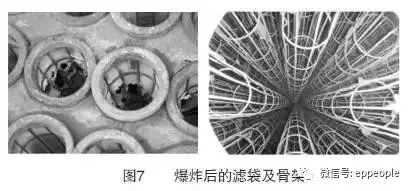 隨著袋式除塵器的普及,袋式除塵器粉塵爆炸事故也呈上升趨勢。如上海某鋼廠的干熄焦除塵系統(tǒng),由于前部阻火墻制造的問題,造成火星進入除塵器內從而引起爆炸,將除塵器進口管道盲板炸出幾十米遠,除塵器箱體嚴重變形。又如沈陽某機制炭廠,由于鋸末在炭化過程中產生大量的焦油和碳氫化合物等易燃、易爆物質,而且焦油粘在濾袋上隨著時間推移越積越多,當有火星進入除塵器后就引起了除塵器爆炸。除塵器爆炸瞬間所產生的能量可使花板嚴重變形,濾袋爆裂情況見圖7。