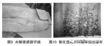 纖維氧化是纖維中分子失去(或離解)電子的過程,如PPS纖維,在高溫(150℃)條件下氧分子攻擊分 子中的“S”,并與之結合。造成PPS纖維變色、變硬、 變脆,強度而破損,嚴重時纖網會破碎而脫離基布 (如圖10)。氧化是濾袋損壞的又一主要因素?寡趸 性能較差的濾料主要有:聚丙烯、聚苯硫醚(PPS)等。