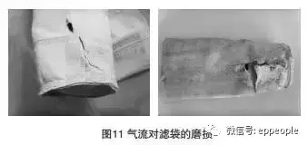 過高的過濾氣速會使粉塵沖擊、磨損濾袋,也會使 濾袋的織物纖維張力受損。除塵器的進氣分布不均,容 易使高含量的大顆粒粉塵直接沖擊局部濾袋,造成廢氣 進口處部分濾袋穿孔(如圖11)。
