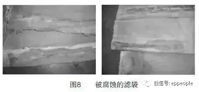 腐蝕損壞的痕跡多為放射狀,并在濾袋表面形成大面積變色,造成濾袋變硬、變脆并出現少量不規(guī)則圓周洞,但與火星燒穿濾袋產生的不規(guī)則圓周洞不同,是可用肉眼分辨出來的。圖8為河南某氧化鎂廠氯化工段的煙氣中的HCl含量高,PTFE濾袋平均使用壽命不到3個月,就被腐蝕得千瘡百孔無法繼續(xù)使用。所以,如果在此條件下進行脈沖清洗濾袋,將會加速濾袋的損壞。