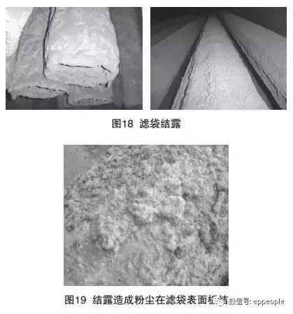 結露是袋式除塵器運行中常見問題(如圖18), 水分是濾袋結露的大原因,造成濾袋含有水分的原因 通常是低溫發(fā)生凝露,尤其在處理燃燒或高溫煙氣時,當濾袋表面的初始粉塵層含有水分,干燥后就會使粉塵 凝結、板結(如圖19)。