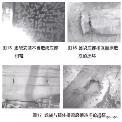 濾袋安裝不良,會由于花板、骨架等原因不與花板 相垂直(如圖15);如果過于偏斜就會造成濾袋底部相 互磨擦而損壞(如圖16);濾袋與壁板及濾袋與箱體橫 梁間也會由于磨擦而造成濾袋損壞(如圖17)。