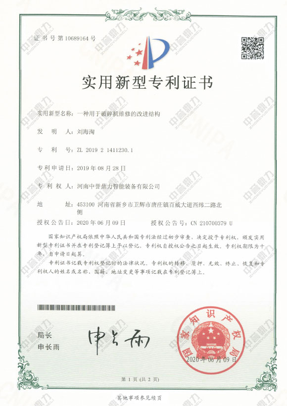 一種用于破碎機維修改進結(jié)構(gòu)專利證書