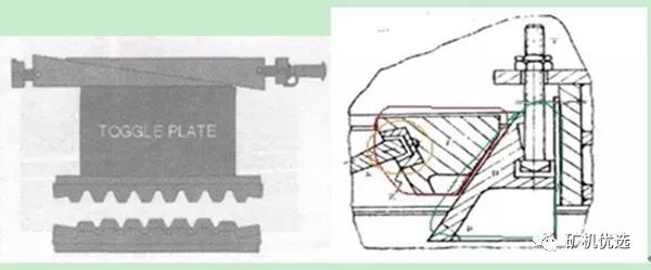 顎板的大小,中間一塊較小,上下兩塊較大,上面也有一個(gè)楔形的東西,叫做固定楔塊或固定壓鐵。顎板靠螺栓固定在中間一塊顎板和壓鐵上。