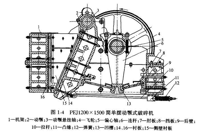 動顎上端直接懸掛在偏疼軸上,作為曲柄連桿機構(gòu)的連桿,由偏疼軸的偏疼直接驅(qū)動,動顎的下端鉸連著推力板支撐到機架的后壁上。當(dāng)偏疼軸旋轉(zhuǎn)時,動顎上各點的運動軌道是由懸掛點的圓周線(半徑等于偏疼距),逐步向下變成橢圓形,越向下部,橢圓形越偏,直到下部與推力板連接點軌道為圓弧線。因為這種機械中動顎上各點的運動軌道比較雜亂,故稱為雜亂搖擺式顎式破碎機。
