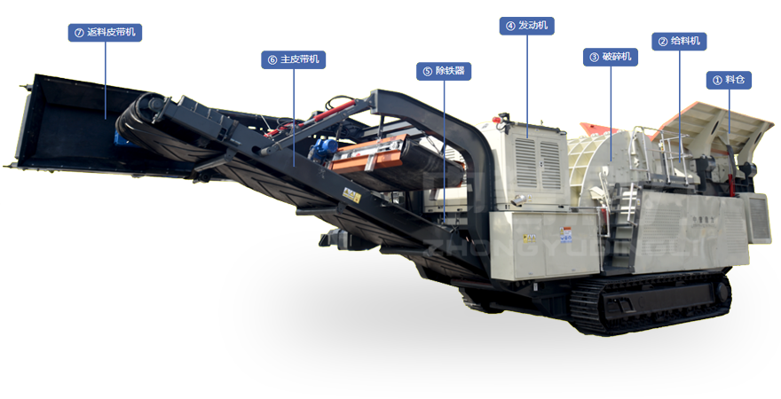 | ⑦返料皮帶機(jī) | 將篩分履帶站的頭層物料輸送到破碎機(jī) |