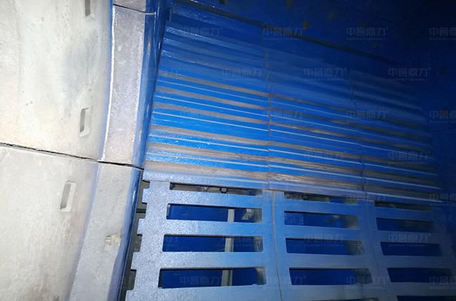 襯板、篦板加厚,增加耐磨性。主、側(cè)襯板的固定采用六角頭高強(qiáng)螺栓,螺栓頭部藏于襯板內(nèi),防止螺栓磨損,襯板脫落。