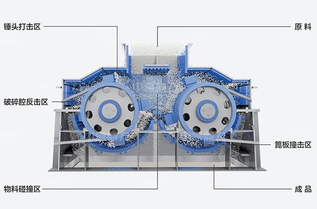 DLZSJ雙轉(zhuǎn)子制砂機(jī)在運(yùn)行過(guò)程中兩個(gè)轉(zhuǎn)子相對(duì)運(yùn)轉(zhuǎn),進(jìn)入破碎腔的物料由一個(gè)轉(zhuǎn)子上的錘頭進(jìn)行打擊破碎并獲得動(dòng)能后高速撞向另一個(gè)轉(zhuǎn)子進(jìn)行再次破碎。同時(shí)高速運(yùn)動(dòng)的物料間也產(chǎn)生碰撞破碎。物料經(jīng)如此多次循環(huán)的打擊而破碎后,經(jīng)條縫隙排出。