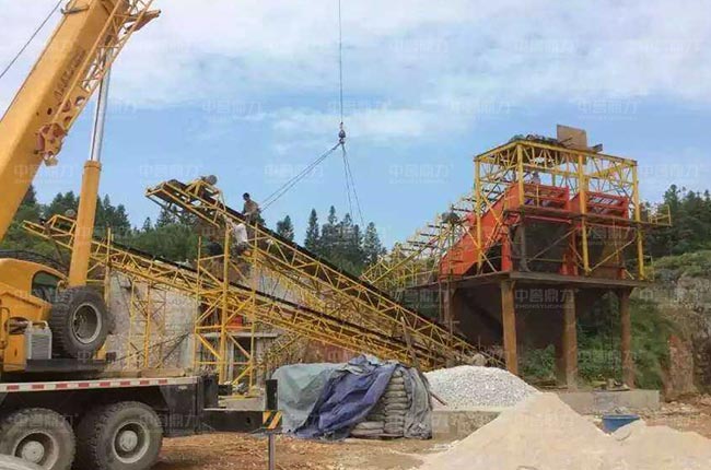 貴州凱里時產(chǎn)300噸石灰?guī)r破碎機生產(chǎn)線,采用一臺ZG1238給料機、一臺PCZ1512重錘破碎機、兩臺3YK1860振動篩和皮帶機,工藝流程簡單,出3種不同規(guī)格的成品骨料。
