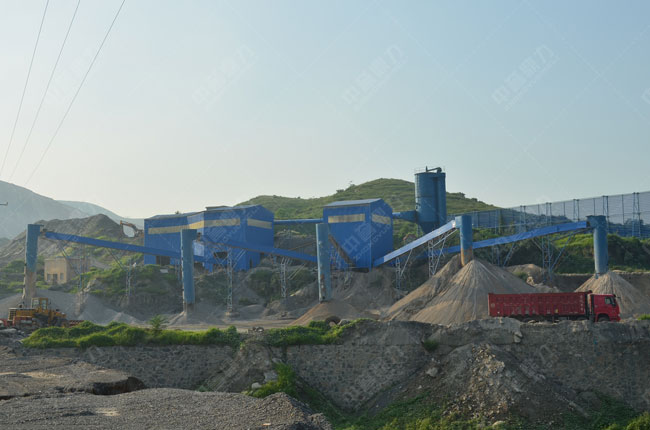 ZG1238振動給料機(jī)、PCZ1512重型錘式破碎機(jī)、2YK2060振動篩*2、DMCA脈沖除塵器*5臺等。在這條石料生產(chǎn)線中,物料先經(jīng)由重型錘式破碎機(jī)進(jìn)行破碎,被破碎后的物料經(jīng)振動篩篩分分級,符合客戶粒度需求的成品物料被傳送至成品料堆,不符合的物料被重新送至破碎機(jī)機(jī)腔內(nèi)進(jìn)行再次破碎。在每一個環(huán)節(jié)都配置有相應(yīng)的除塵設(shè)備。這是一條封閉型的環(huán)保石料生產(chǎn)線。也是我們家砂石生產(chǎn)行業(yè)要發(fā)展的方向。