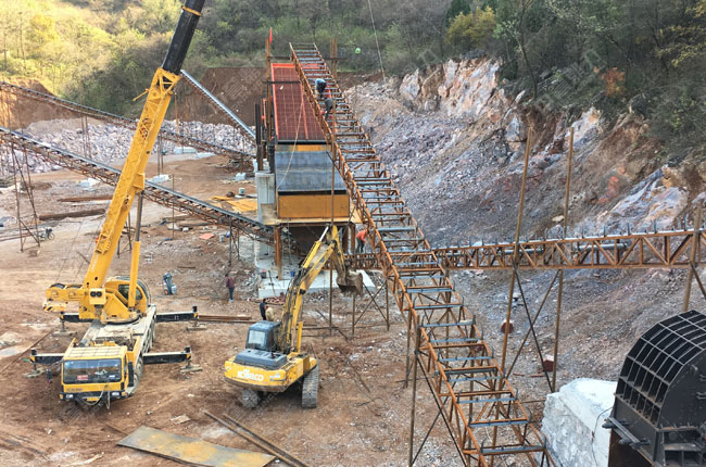 華隆攪拌站時產(chǎn)700噸骨料生產(chǎn)線為新建項(xiàng)目,采用了中譽(yù)鼎力pcz1615重錘破、pc1216整形破以及配套給料機(jī)、振動篩等設(shè)備,主要生產(chǎn)1-3、1-2、0-5、石粉石料,項(xiàng)目已于2018年1月投產(chǎn)使用。