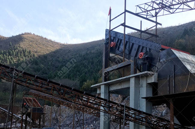 石灰石原料由重型錘式破碎機(jī)進(jìn)行粗碎,破碎后大于31mm的石料由皮帶機(jī)送至1216整形機(jī)二次破碎;破碎后的石料經(jīng)3ykz40100篩分出來的小于1-3的料,會送至2ykz3070篩分,后篩分出1-2/0-5和石粉三種成品料。
