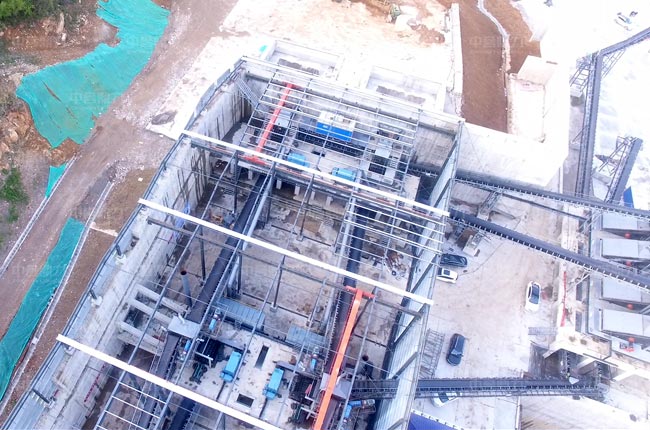 該封閉式砂石料場雙線并行,兩臺DLZG振動給料機、兩臺DLPCZ重型錘式反擊破碎機、兩臺DLPC整形式破碎機和多臺DLYKZ重型振動篩及配套輸送、除塵等設(shè)備。