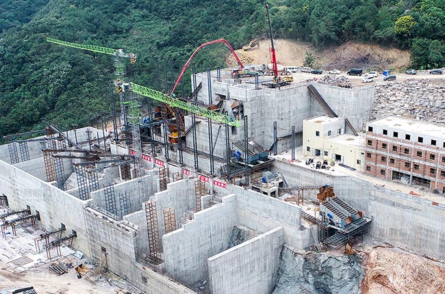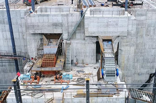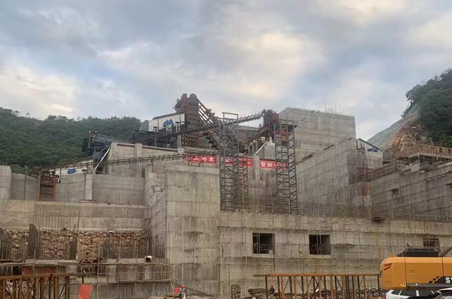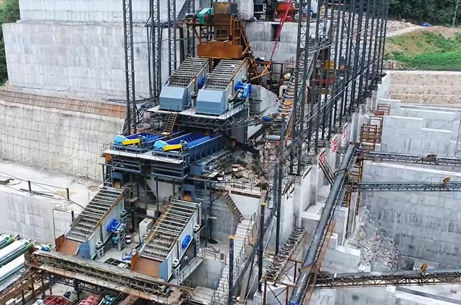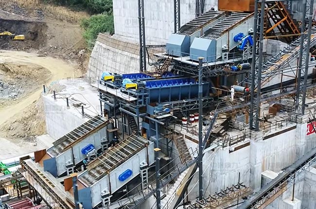 夢皓礦業(yè)時產2000噸生產線由兩條時產1000噸的砂石骨料生產線組成,采用干濕結合的工藝。該生產線利用場地地形落差進行建設,巧妙地對于含泥量較高的原料,采用水洗骨料生產線進行處理,該生產線使用了水洗線采用已使用近10年的1620重錘破及整套配設備,新建骨料生產線配備了1815重錘式破碎機、1622二破和3080稀油振動篩等設備,可產出246碎石、瓜子片、水洗砂、58子等8種不同規(guī)格的骨料產品。