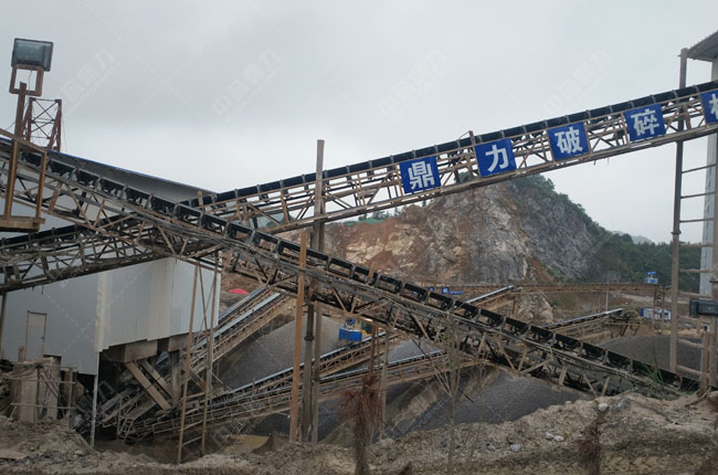 石灰?guī)r原石料經(jīng)1238給料機(jī)送入PCZ1512重錘破進(jìn)行破碎,之后由皮帶機(jī)送入2470輕型振動篩篩選,后經(jīng)輸送機(jī)送至不同規(guī)格的成品料堆。
