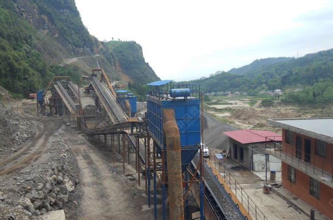 大塊石灰石通過給料機均勻地將石灰石送進重錘式破碎機進行粗碎,粗碎后的石料由輸送機送到整形破進行整形破碎,再通過振動篩進行篩選,篩分出不同規(guī)格的石料,由輸送機送往成品料堆,為實現綠色環(huán)保,該生產線搭配了袋式除塵設備。