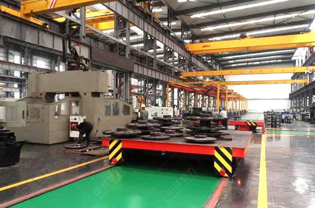 用于各個(gè)工位間的產(chǎn)品轉(zhuǎn)運(yùn),具有自動(dòng)行走、自動(dòng)移載功能;采用滑觸線取電,與工位臺(tái)之間采用掃描二位碼定位;與工位臺(tái)之間采用以太網(wǎng)無線通訊;主線方向上行走采用變頻調(diào)速,速度范圍0-40m/分鐘;橫向移載采用定速輸送產(chǎn)品,速度12m/分鐘;