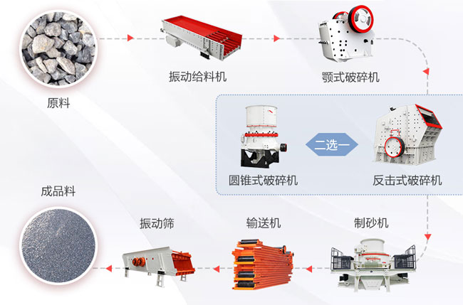 大型:喂料機+顎破機(初級破碎)+圓錐石子機(二破)+制砂機械+洗石機(選配)+篩機
