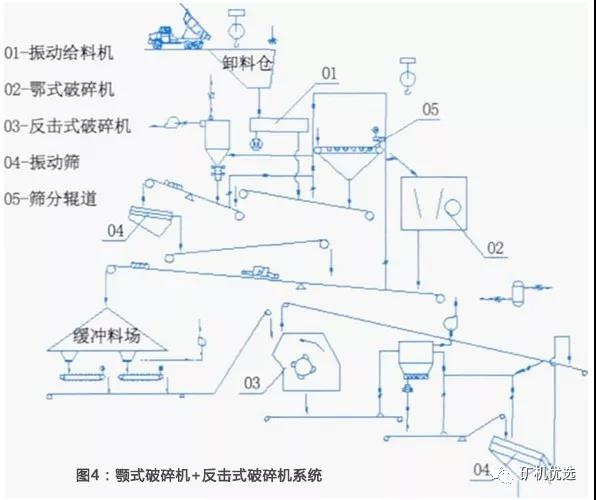 由顎式破碎機、反擊式破碎機和篩分系統(tǒng)組成,見圖4。