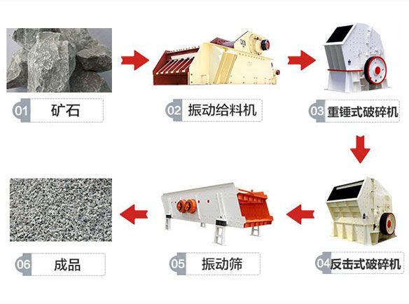 配置機械:重反擊錘式破碎機+震動喂料機+振動篩分設(shè)備+傳送機