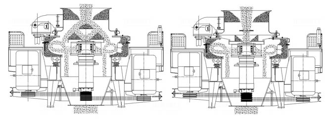 vsi制砂機(jī)分全中心進(jìn)料(右圖)和中心進(jìn)料伴隨瀑落(左圖)兩種進(jìn)料方式,破碎方式有“石打石”(圖中轉(zhuǎn)子左側(cè))和“石打鐵”(圖中轉(zhuǎn)子右側(cè))兩種,破碎原理相同,不同的是石打石”成品粒形好,“石打鐵”是石料沖擊周護(hù)板破碎,比較適合中硬度的石料,破碎效率高。