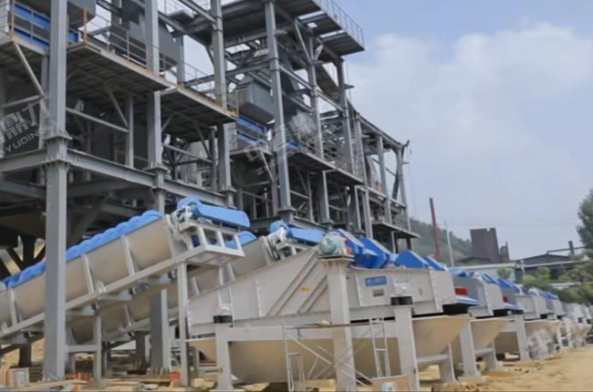 雙線并行方案,可根據(jù)需求單雙線運(yùn)行,某一工藝環(huán)節(jié)出問題不形象另一生產(chǎn)線正常運(yùn)行,可避免全線停機(jī),在洗沙工藝中,采用輪式洗砂機(jī)+脫水篩組合,優(yōu)勢(shì)是比螺旋洗砂機(jī)省水且洗砂流失少。