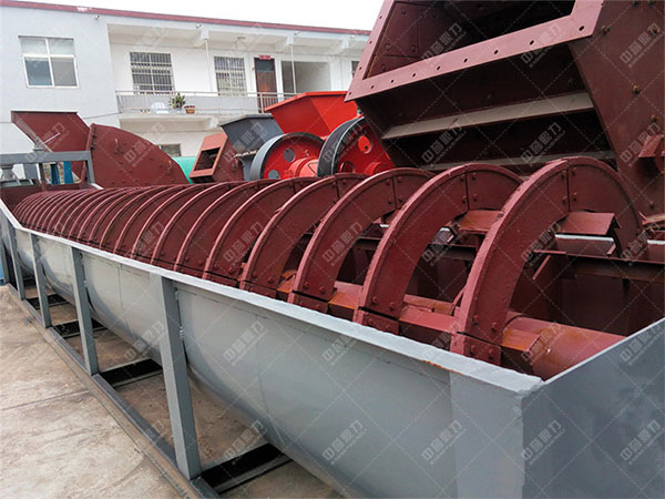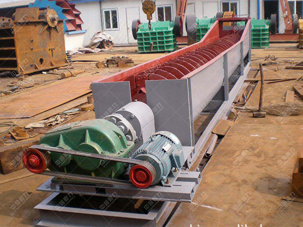 螺旋水洗沙機(jī)器由槽體、減速機(jī)、電機(jī)、軸、螺旋葉片、支架構(gòu)成,支架焊接在軸上,螺旋葉片安好后用螺絲壓緊,使葉片不下垂不彎曲,
