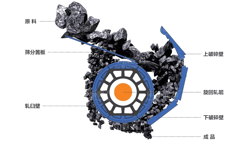 臥式旋回破碎機內(nèi)部是由篩分篦板、上破碎壁、旋回軋輥、下破碎壁、軋臼壁組成。