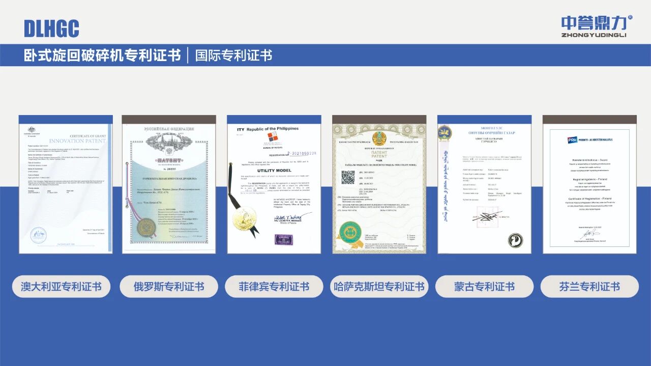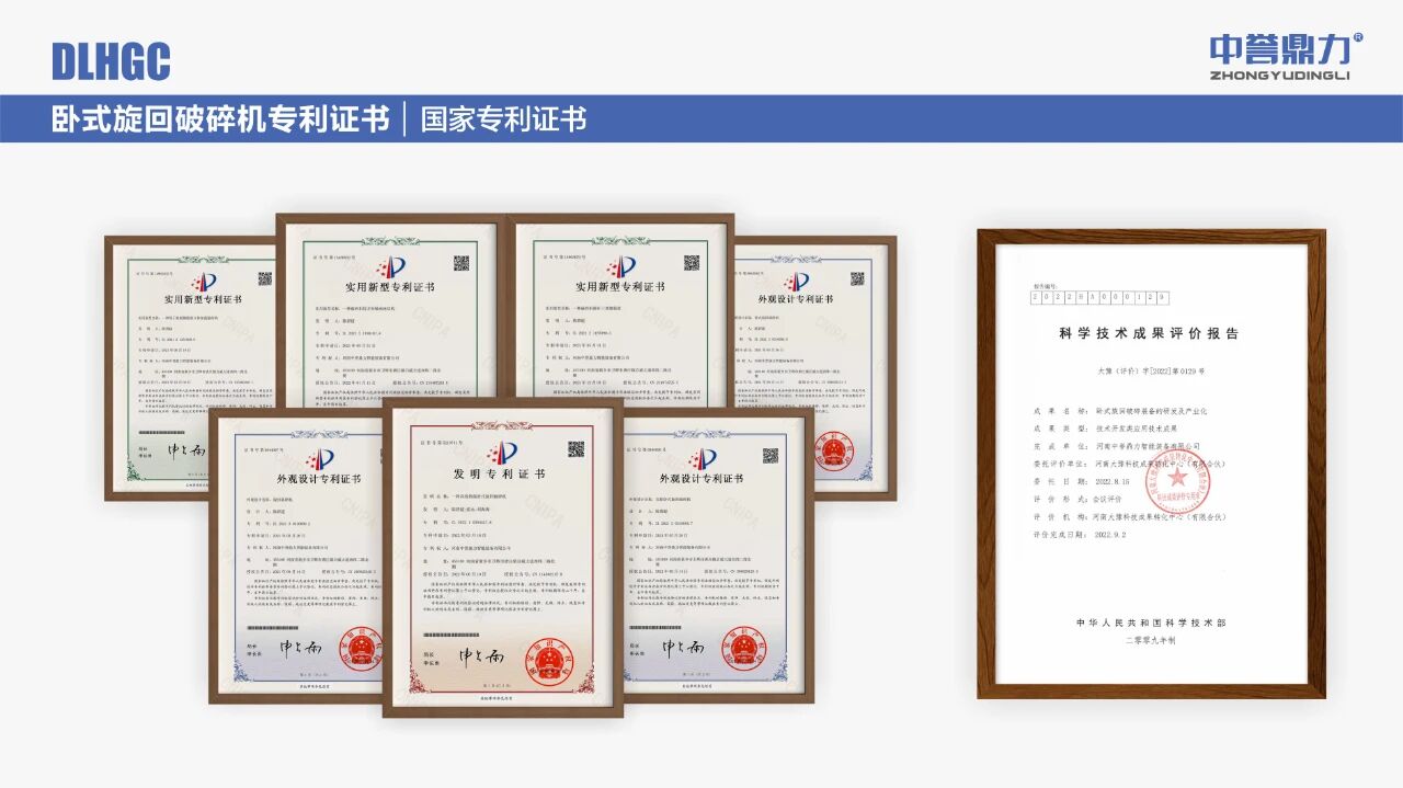 中譽鼎力臥式旋回破碎機不僅先后獲得1項科學技術成果、多項國家專利【[發(fā)明專利(ZL 2022 1 0254447.6)] 一種高效智能臥式旋回破碎機;[外觀專利(ZL 2021 3 0316696.X)] 臥式旋回破碎機;[外觀專利(ZL 2021 3 0316696.X)] 雙腔臥式旋回破碎機;[實用新型(ZL 2021 2 1351908.8)] 一種用于機架側板的立體加強筋結構;[實用新型(ZL 2021 2 1187890.3)] 一種破碎機排礦口調整裝置;[實用專利(ZL 2021 2 1188187.4)]一種破碎機用方形軸承座結構】和6項國際專利(查看國際專利)。