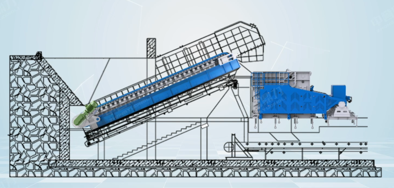 從工藝設計角度來說,傳統(tǒng)旋回破進料模式無喂料裝置,對于較大物料的滑落較為不利,對原料的堵塞需要更多的應對時間。而臥式旋回破與振動給料機或板喂機搭配,可以減少此類問題的發(fā)生以及實現(xiàn)快速處理。