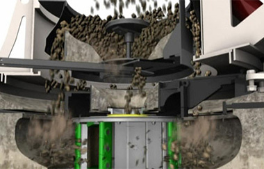 vs碎石整形機(jī)工作時(shí),物料由機(jī)器上部垂直落入高速旋轉(zhuǎn)的葉輪內(nèi),在高速離心力的作用下,與另一部分以傘狀形式分流在葉輪四周的物料產(chǎn)生高速撞擊破碎,物料在相互撞擊后,又會(huì)在葉輪和機(jī)殼之間以物料形成渦流多次的互相撞擊,摩擦而粉碎,從下部直通排出,通過篩分設(shè)備控制達(dá)到所要求的成品粒度。