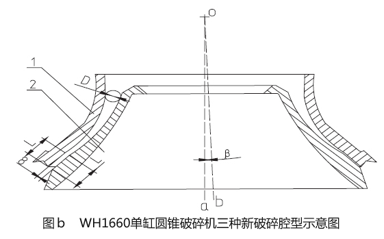 如圖a 所示,為WH1660單缸圓錐碎石機原粉碎型腔的示意簡圖。形成粉碎腔型的兩個零件分別是不變襯板(1)及動錐襯板(2)。不變襯板的內側曲面與動錐襯板的外側曲面所夾的環(huán)形空間即為粉碎型腔。