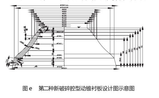 我們生產線設計小組用了半個月的時間設了三種新粉碎腔型(如圖b 所示,詳細數(shù)值見表c)。三種粉碎腔型相應的不變襯板及動錐襯板的圖紙設計完畢后,立即投入了生產解決,并在三套新備件回來后,我們在連續(xù)三個襯板的采用周內,分別在平均莫氏硬度f=12 的鐵巖石整型破碎生產中試用了這三種腔型,在生產平均莫氏硬度f=12 的鐵巖石整型破碎生產時,由于粉碎腔型中平行粉碎帶斜長的增加,整型破碎效果越來越好,但過分增加,勢會引起整型破碎加工能力的指標要求。結合三種新式腔的采用效果,我們終采用了種型腔,與它相連的不變襯板及動錐襯板的效果圖分別如圖d、圖e 所示。