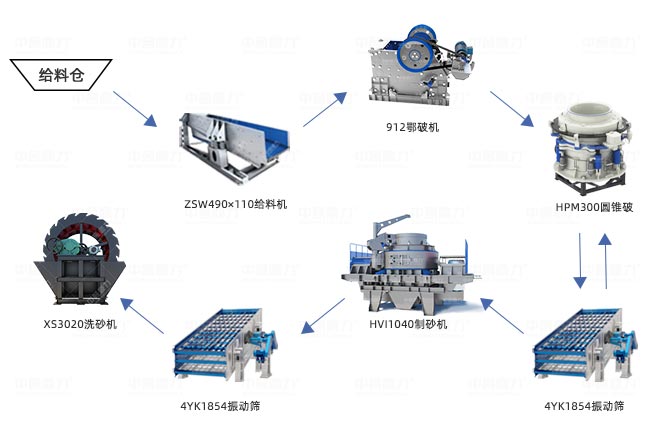 方案二:適合原料粒度≤300mm,采用破碎機(jī)、制砂機(jī)、振動(dòng)篩和輸送機(jī)工藝,破碎機(jī)負(fù)責(zé)破碎、制砂機(jī)細(xì)碎制砂。